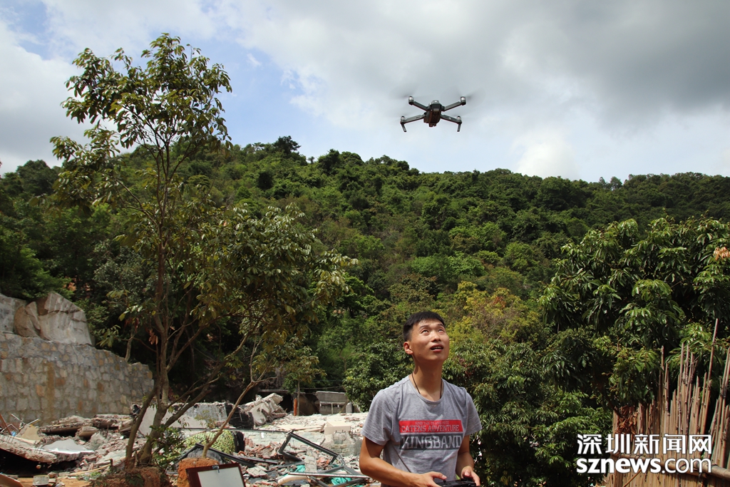 深圳新聞網(wǎng)記者正在操作無人機(jī)對羊臺山兩棟拆除后的違法建筑廢墟進(jìn)行拍攝