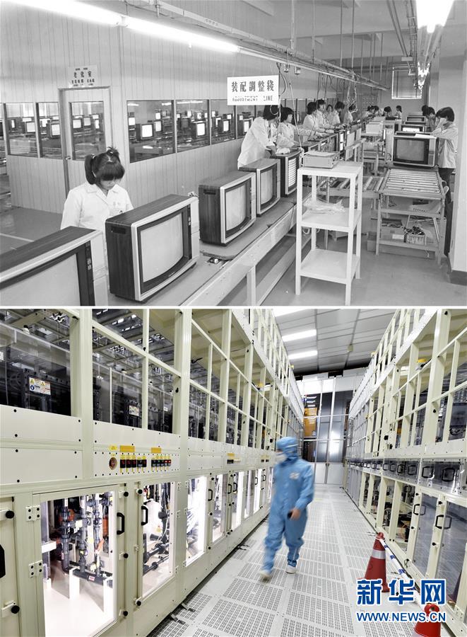拼版照片:上圖為工人在深圳華利電子有限公司彩色電視機生產(chǎn)線工作(資料照片,新華社記者李長永攝);下圖為2018年6月13日,工作人員在柔宇科技首條類六代全柔性顯示屏大規(guī)模量產(chǎn)線巡檢設備狀態(tài)(新華社記者毛思倩攝)。新華社發(fā)