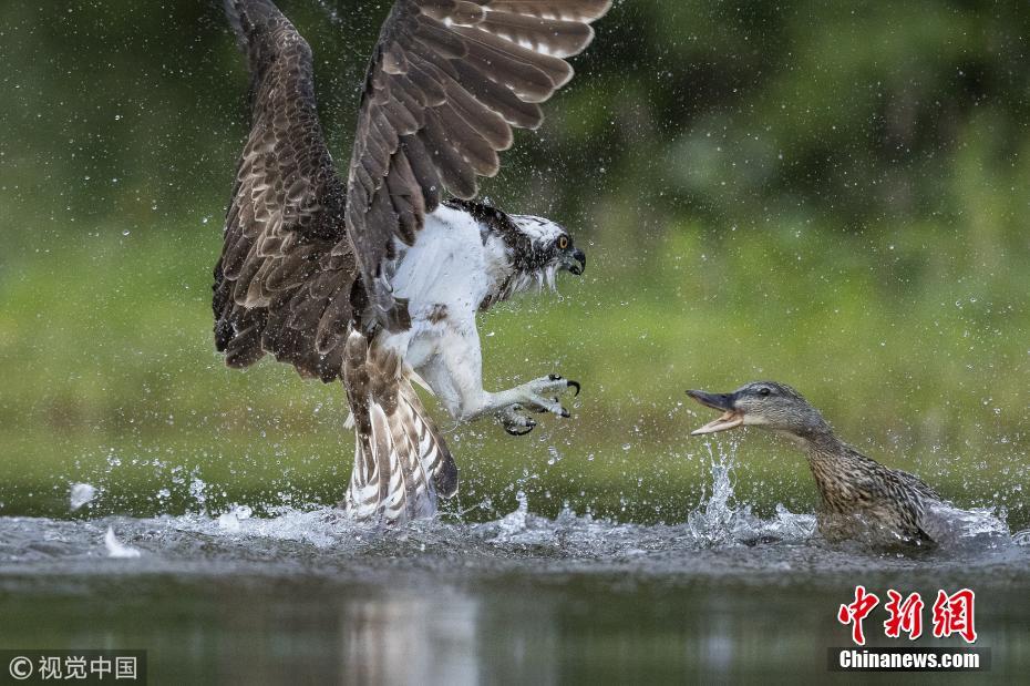 2018年6月21日訊(具體拍攝時間不詳),英國蘇格蘭高地,一只憤怒的綠頭鴨襲擊一只捕食的魚鷹。攝影師Andy Howard對于當時眼前的景象感到十分震驚,并用鏡頭記錄下來了整個打斗過程。母鴨最后跳到魚鷹背上,害得魚鷹不得不丟下到手的鱒魚落荒而逃。他表示,沒有發(fā)現(xiàn)任何明顯的原因會引發(fā)這場打斗,母鴨并沒有幼崽需要保護,而魚鷹也不吃鴨子?!盀榱粟s在晨光出現(xiàn)時拍照片,我必須凌晨2點鐘就起床,但我當時并不知道有這么精彩的一出戲在等著我?!?圖片來源:視覺中國