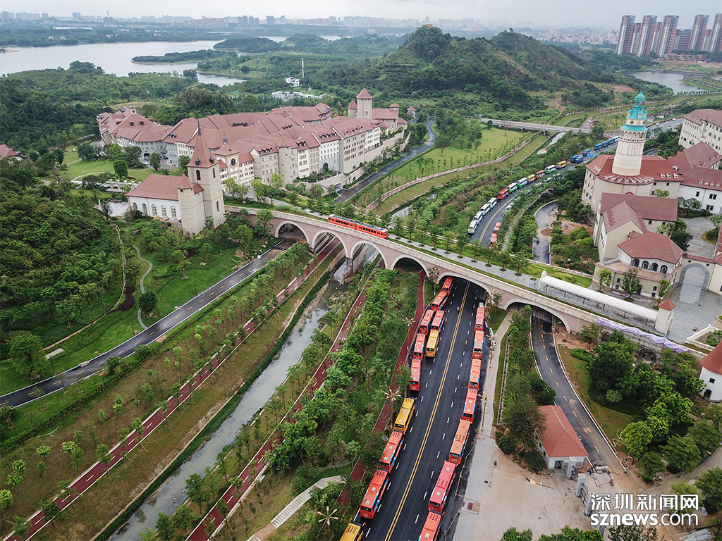 專(zhuān)為家住深圳的員工準(zhǔn)備的通勤大巴整齊停在道路兩側(cè)