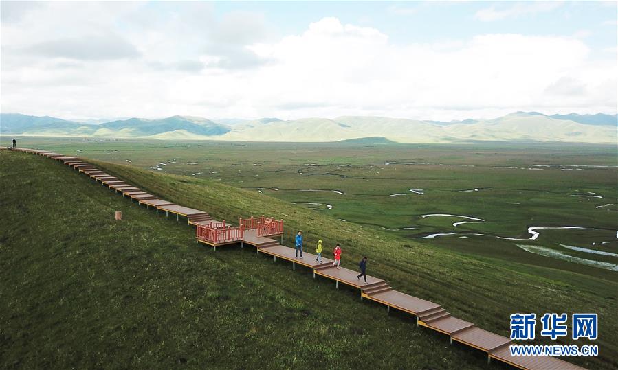 游客在瑪曲縣阿萬倉濕地的觀景步道上游覽(7月31日無人機(jī)拍攝)。 新華社記者 陳斌 攝