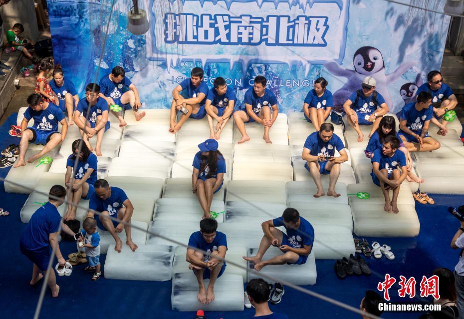 8月11日,在企鵝館舉行的決賽中,工作人員給參賽選手桶里加冰塊。當(dāng)日,一場充滿趣味性的“冰極挑戰(zhàn)賽”在武漢海昌極地海洋世界上演,參賽者們經(jīng)過“極地初體驗”和“極寒企鵝館耐寒挑戰(zhàn)”兩個環(huán)節(jié),堅持時間長者獲勝。中新社記者張暢 攝