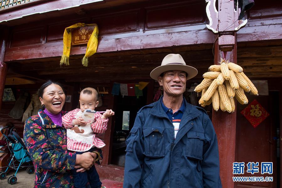 寧蒗永寧鄉(xiāng)泥鰍溝村委會(huì)八珠村民小組的摩梭人阿普私根(右)站在自家門口(7月30日攝)。他家是摩梭母系家庭重點(diǎn)保護(hù)民居,依靠旅游服務(wù)等家庭年收入近20萬(wàn)元。新華社記者 胡超 攝