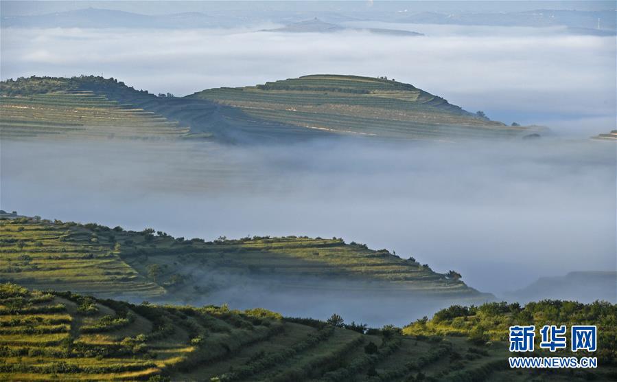 云霧繚繞的寧夏彭陽縣金雞坪梯田公園(7月17日攝)。新華社記者 王鵬 攝