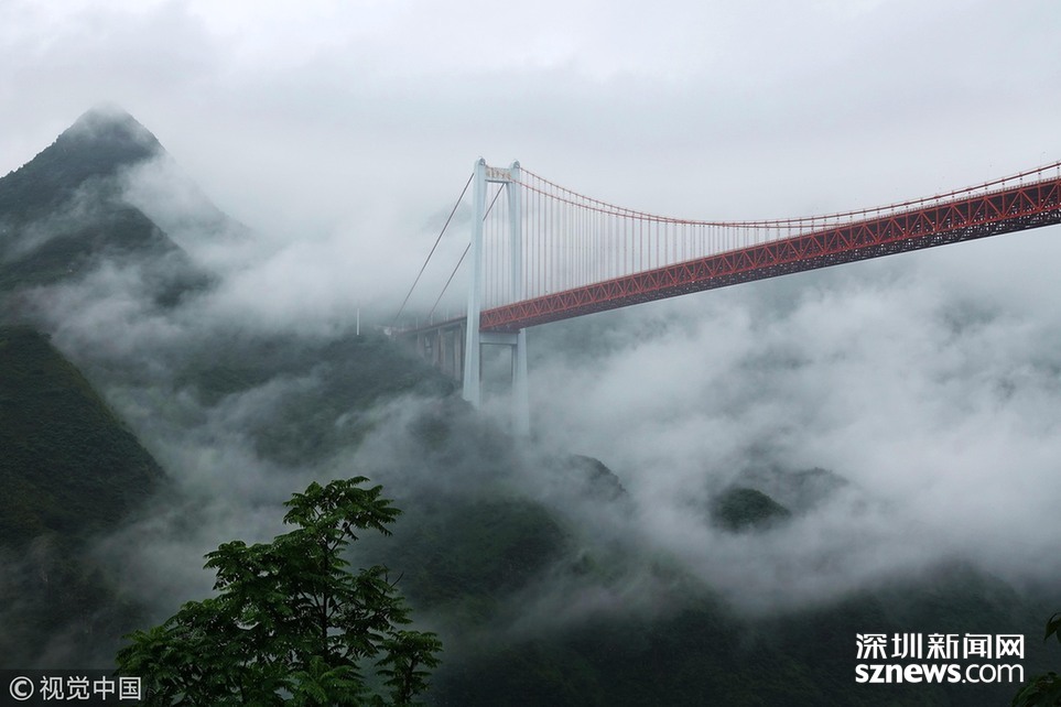 2018年6月26日,一場大雨后貴州省安順市關(guān)嶺縣壩陵河大峽谷云霧繚繞,橫跨兩岸的壩陵河大橋在云霧中時(shí)隱時(shí)現(xiàn),更顯雄偉壯觀。