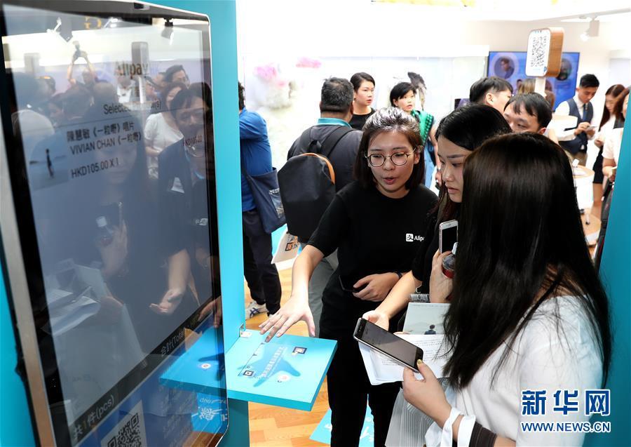 9月5日,工作人員在無人零售商店演示付款結(jié)賬方法。當日,香港首家AlipayHK(支付寶香港版)無人零售商店在九龍區(qū)奧海城開業(yè)。商店占地約370平方米,售賣多款時尚精品、服飾等,還引入一臺智能機械臂,為顧客現(xiàn)場沖調(diào)香濃咖啡。新華社記者李鋼攝