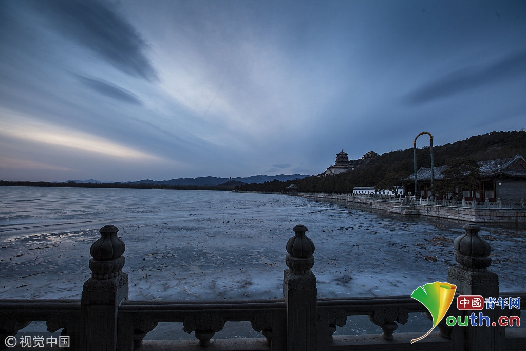 2018年2月23日,北京頤和園。當(dāng)天日落時(shí)分昆明湖上空出現(xiàn)夕陽余暉的美景,夢(mèng)幻般的色彩將古老的皇家園林裝扮得美輪美奐,讓人流連忘返。