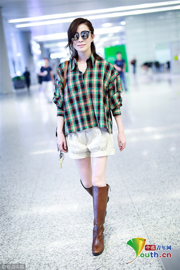 2018年9月9日,“嫻妃”佘詩曼從上海機場飛往北京機場,她擺“剪刀腿”大方任拍,身穿格紋襯搭配衫燈籠褲,時髦青春衣品超贊!