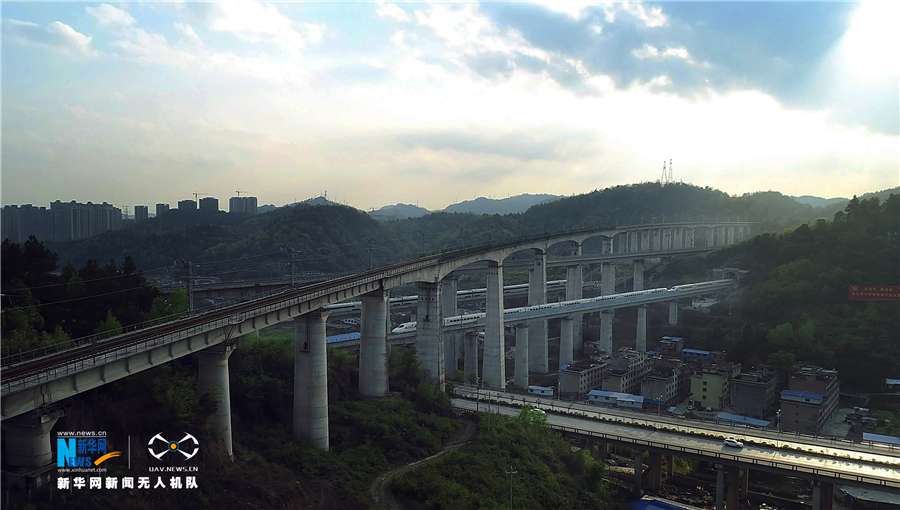 貴州省地處中國(guó)西南腹地,全省高原山地居多,因此高鐵建設(shè)的橋隧占比較高。在貴陽(yáng)市烏當(dāng)區(qū)新添寨,高鐵滬昆線、貴廣客運(yùn)專線、貴開城際客運(yùn)專線的隧道和橋梁交織在一起,形成“五洞五橋”并行,形似“五龍出海”的壯觀景象。圖為3月29日,新華網(wǎng)無(wú)人機(jī)航拍兩輛動(dòng)車在線路上會(huì)車。新華網(wǎng)周遠(yuǎn)鋼 攝