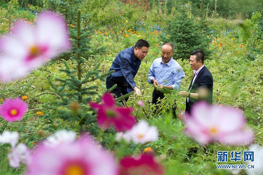 在寧夏固原市西吉縣吉強鎮(zhèn)龍王壩村,固原市農業(yè)學校林業(yè)高級講師鄧志力(中)在指導村民進行油用牡丹種植(8月30日攝)。