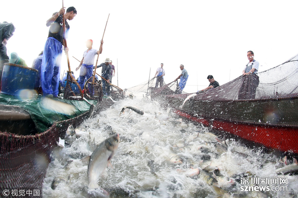 2018年6月26日,江蘇省常州市嘉澤鎮(zhèn)捕撈村的漁民組織夏季捕撈,一網(wǎng)魚達五萬余斤,以鰱魚為主,供應(yīng)市場需求。夏捕的魚價較平時有所上漲,漁民粗略估計可增收上萬余元。