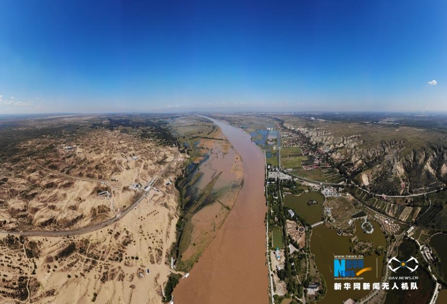 航拍黃河托克托段兩岸風(fēng)光,一邊是魚(yú)米之鄉(xiāng),一邊是浩瀚沙漠。新華網(wǎng) 張偉 攝