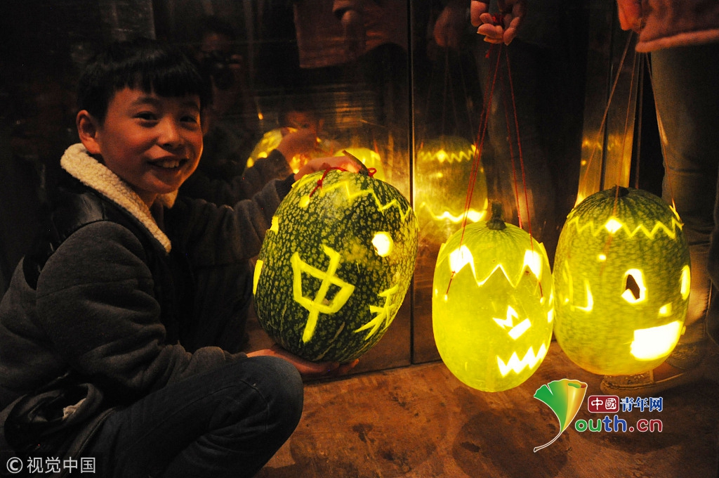 2015年9月27日,貴州省威寧縣海邊街道大洼塘社區(qū),一名孩子在展示手工制作的瓜燈。當日,是中國傳統(tǒng)節(jié)日“中秋節(jié)”,群眾與孩子們一道制作手工瓜燈,歡度中秋佳節(jié)的到來,當?shù)赜兄谱鞴蠠魬c中秋的習(xí)俗。