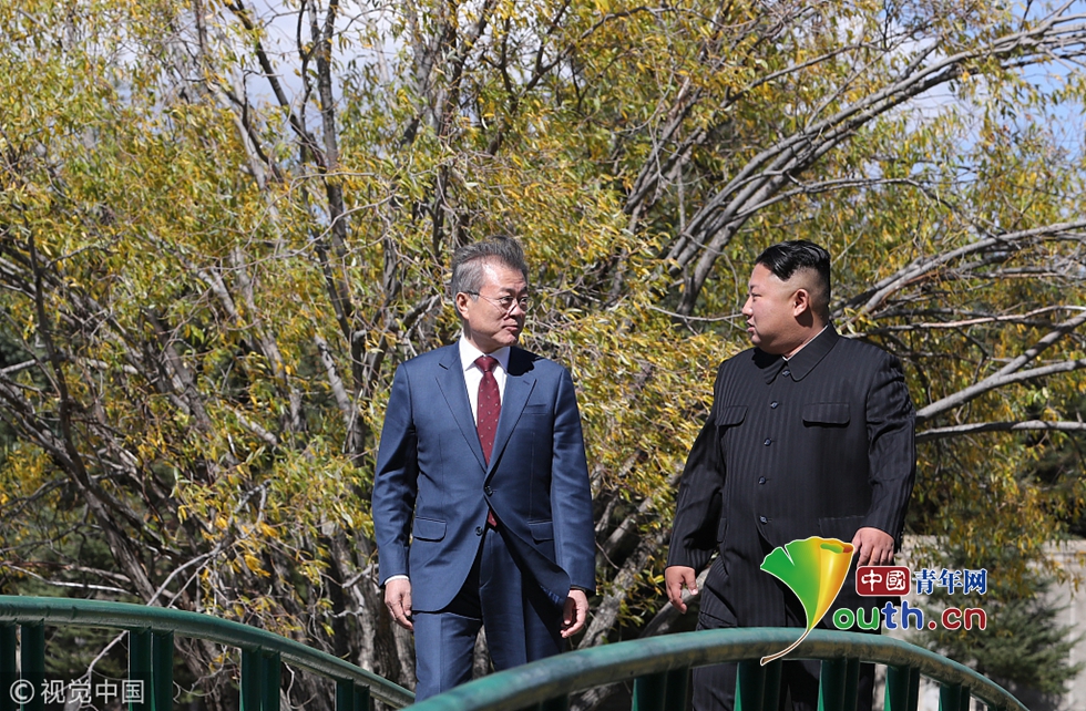 當(dāng)?shù)貢r(shí)間2018年9月20日,朝鮮,韓國(guó)總統(tǒng)文在寅和朝鮮領(lǐng)導(dǎo)人金正恩在三池淵招待所共進(jìn)午餐后散步。圖片作者:Yonhap News Agency/視覺(jué)中國(guó)