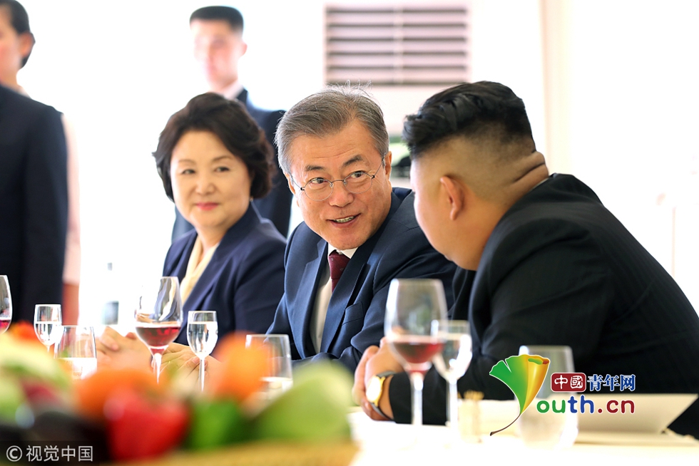 當?shù)貢r間2018年9月20日,朝鮮,韓國總統(tǒng)文在寅在三池淵招待所和金正恩夫婦一起共進午餐。圖片作者:Yonhap News Agency/視覺中國