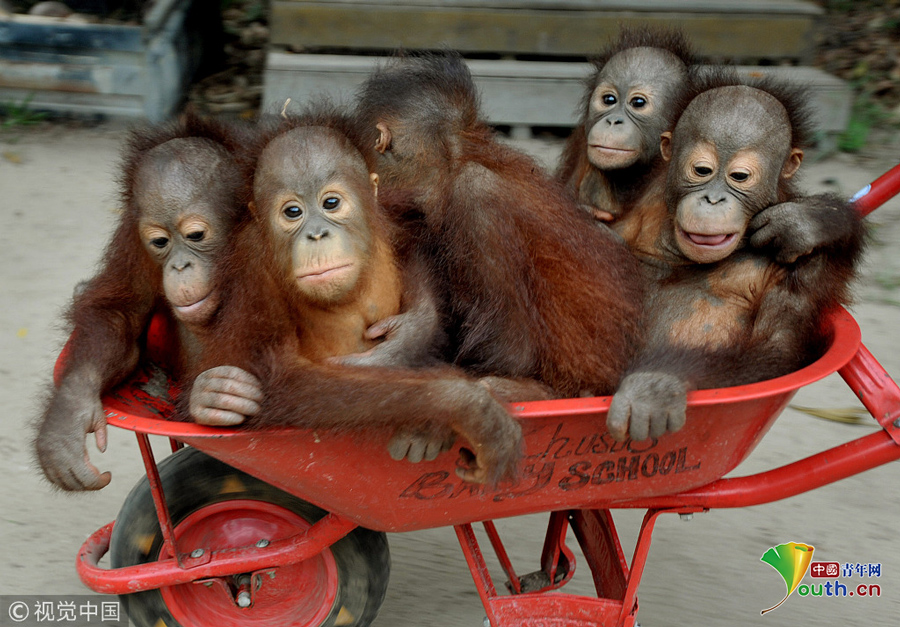 印尼加里曼丹克塔邦,國(guó)際動(dòng)物救援(IAR)猩猩安全與保護(hù)中心里,飼養(yǎng)員用獨(dú)輪車把猩猩寶寶送到森林學(xué)校。圖片作者:Newscom