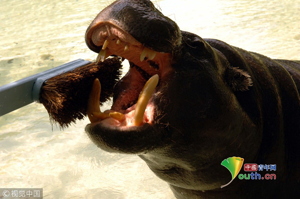 2006年7月20日,英國(guó)倫敦動(dòng)物園里,工作人員正在用一個(gè)新的5英尺長(zhǎng)的牙刷給河馬Thug刷牙。動(dòng)物園里的兩只河馬Nicky與Thug,它們分別有一個(gè)粉色和藍(lán)色的牙刷。為了慶祝換新牙刷,倫敦動(dòng)物園將在23日“不要忘記牙刷日”實(shí)行入園半價(jià)優(yōu)惠。