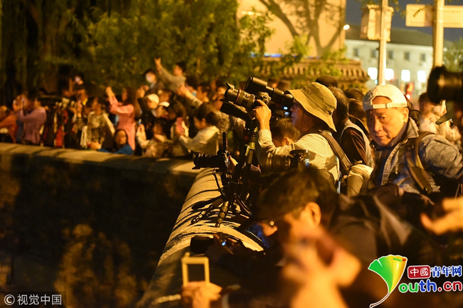 許多市民和攝影愛好者聚集故宮角樓下拍攝月亮。圖片作者/視覺中國