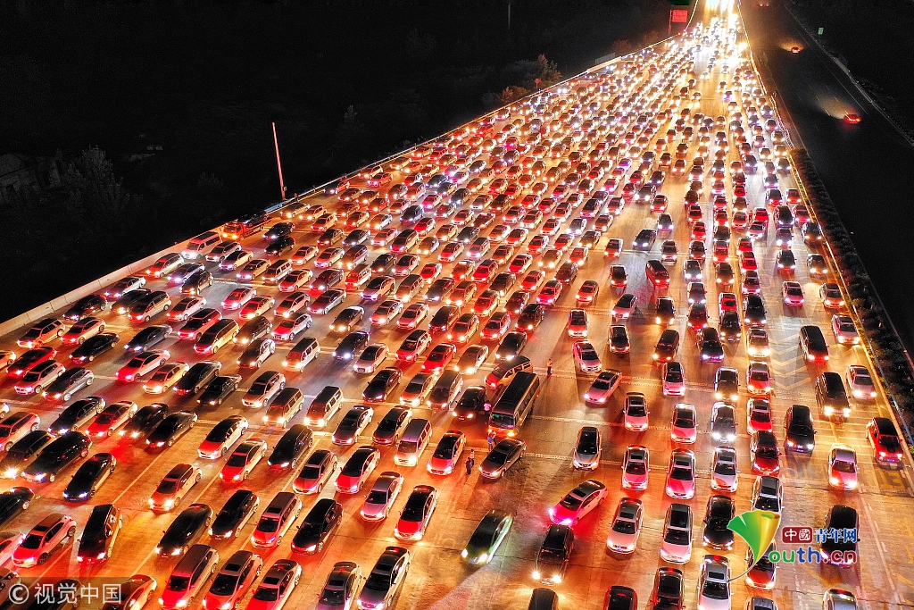 從天上鳥瞰,車輛的尾燈宛若一條紅色的巨龍,望不到盡頭,場面十分壯觀。