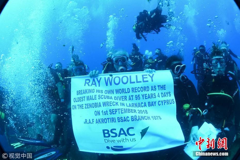 當(dāng)?shù)貢r間2018年9月1日,塞浦路斯,95歲的英國潛水員雷·伍利(Ray Woolley)以44分鐘下潛40.5米的成績打破了自己94歲達成的記錄(41分鐘下潛38.1米),二度刷新了世界上年齡最大的男性潛水員最好成績。在此次下潛中,這位二戰(zhàn)退伍老兵對距塞浦路斯南部城鎮(zhèn)拉納卡約2公里處的海域進行了探索,1980年一艘名為“芝諾比亞號”(Zenobia)的貨船在這里進行首次航行時沉沒。圖片來源:視覺中國