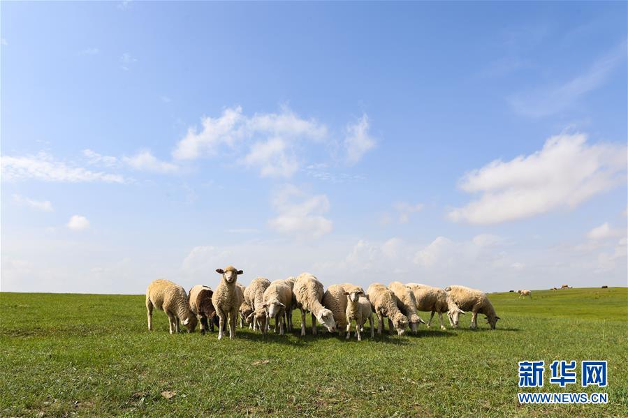 羊群在錫林郭勒盟正藍旗的草原上覓食(7月16日攝)。盛夏時節(jié),內(nèi)蒙古錫林郭勒草原一碧千里,遙接天際。藍天白云之下,牛羊悠閑自在,馬群奔馳其中,風(fēng)光旖旎。 新華社記者 劉磊 攝