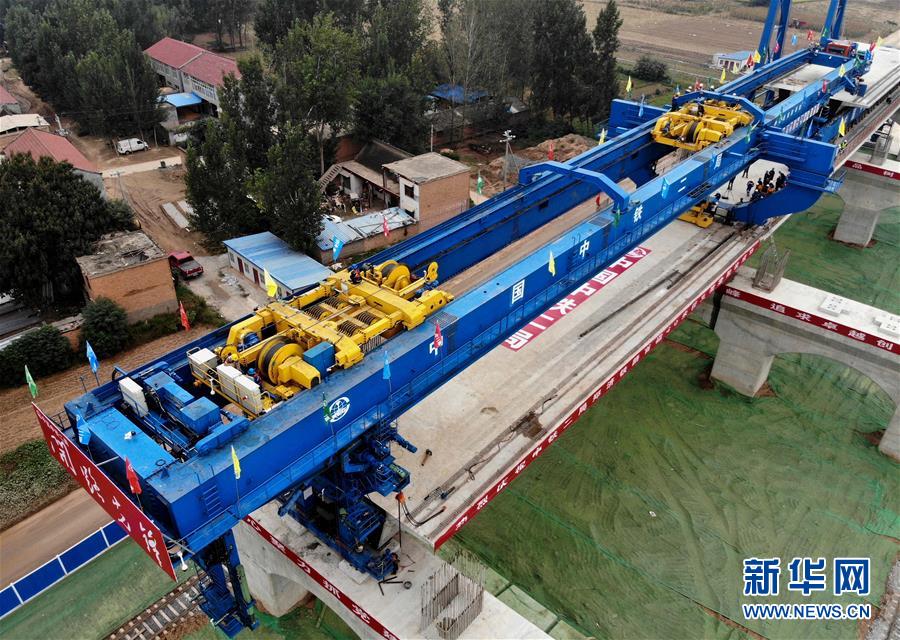 9月27日,中鐵二局的施工人員使用大型機(jī)械在鄭(州)濟(jì)(南)高速鐵路(鄭濮段)站前工程VI標(biāo)施工現(xiàn)場(chǎng)架設(shè)40米簡(jiǎn)支箱梁(無人機(jī)拍攝)。 新華社記者李安攝