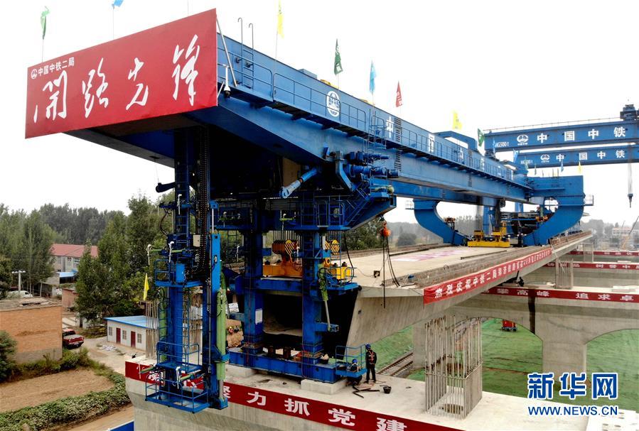 9月27日,中鐵二局的施工人員使用大型機(jī)械在鄭(州)濟(jì)(南)高速鐵路(鄭濮段)站前工程VI標(biāo)施工現(xiàn)場(chǎng)架設(shè)40米簡(jiǎn)支箱梁(無人機(jī)拍攝)。