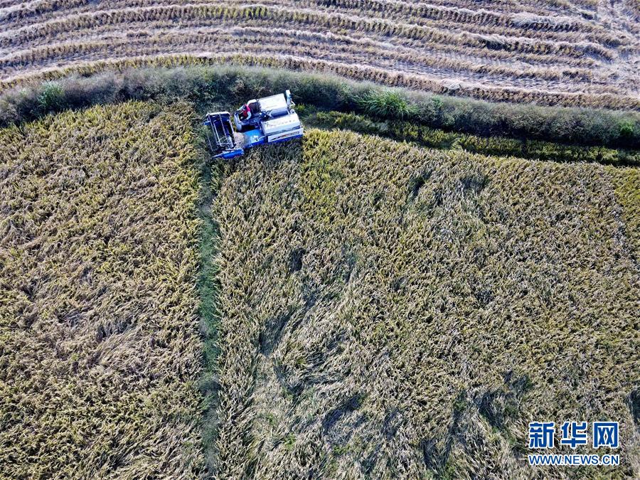 9月27日,在鳳陽(yáng)縣小崗村,農(nóng)民駕駛收割機(jī)收割水稻(無(wú)人機(jī)拍攝)。新華社記者 劉軍喜 攝
