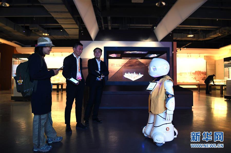 9月27日,在敦煌國際會展中心,機器人為參觀者講解“古道天馬——絲綢之路上的交通”展覽。 新華社記者范培珅攝