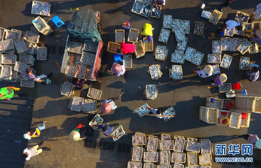 返港漁民在廣西北海市僑港鎮(zhèn)電建漁港的碼頭卸貨(9月26日無(wú)人機(jī)拍攝)。 新華社記者 黃孝邦 攝