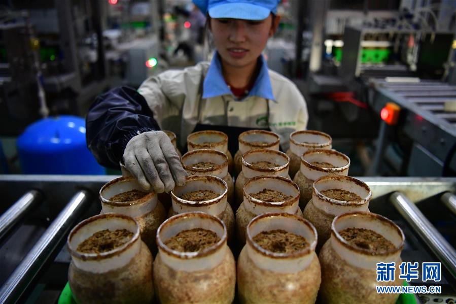 在位于清豐縣的河南龍豐實(shí)業(yè)股份有限公司,一名工人在車間查看補(bǔ)水過(guò)后的食用菌栽培瓶(9月28日攝)。新華社記者馮大鵬攝