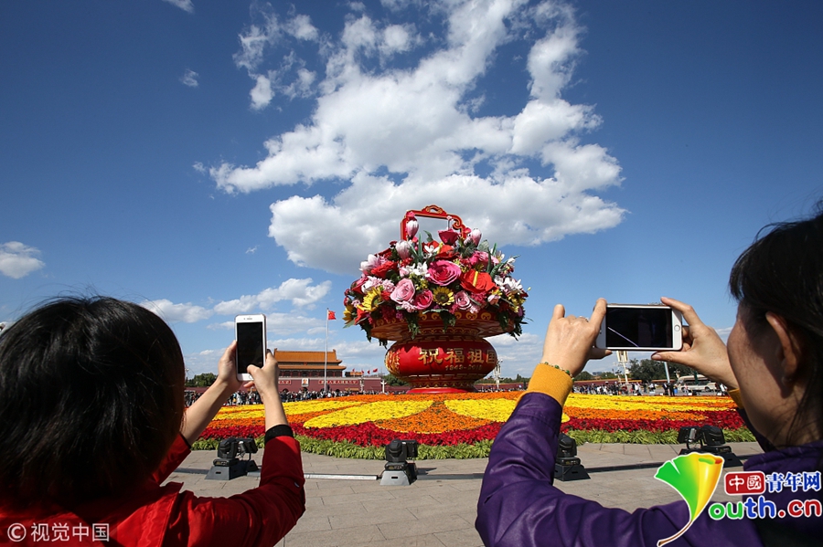 2018年9月29日,北京迎來(lái)高顏值好天氣,天安門(mén)廣場(chǎng)“祝福祖國(guó)”花壇在藍(lán)天白云映襯下壯美如畫(huà)。游客紛紛拿起手機(jī)、相機(jī)拍照留影充滿節(jié)日氣氛。