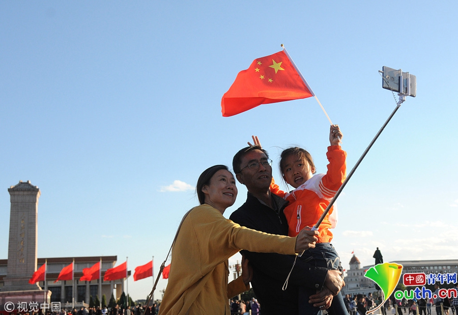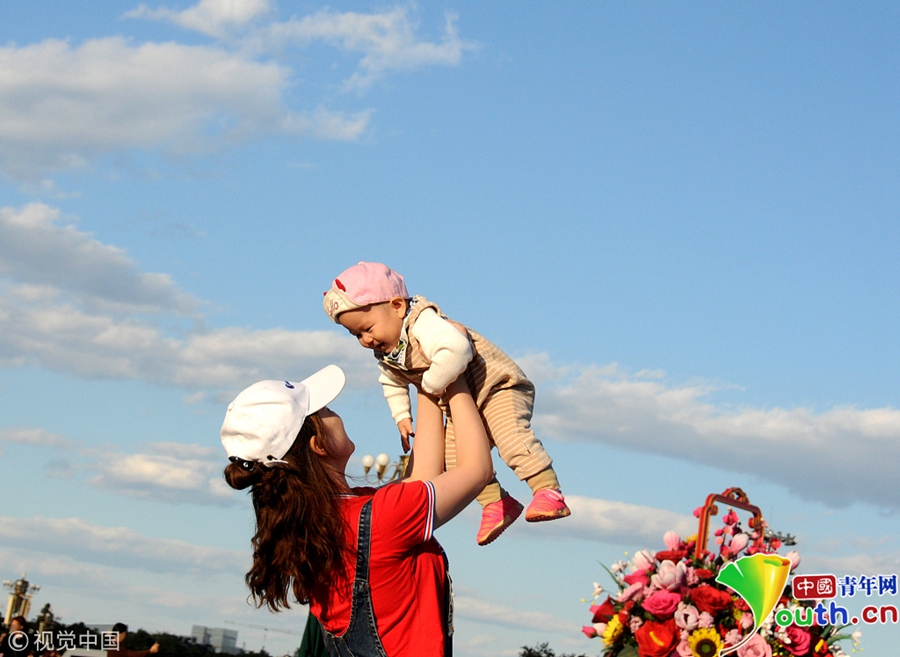 2018年9月29日,北京迎來高顏值好天氣,天安門廣場“祝福祖國”花壇在藍(lán)天白云映襯下壯美如畫。游客紛紛拿起手機、相機拍照留影充滿節(jié)日氣氛。