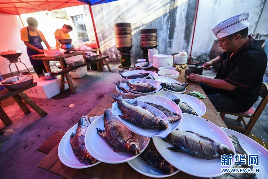 9月30日,工作人員在準(zhǔn)備江鮮宴席。當(dāng)日,浙江省杭州市富陽(yáng)區(qū)場(chǎng)口鎮(zhèn)東梓關(guān)村開(kāi)啟“江鮮第一鍋”,幾位大廚聯(lián)手在直徑1.5米的大鍋內(nèi)烹制美味江鮮,這也是當(dāng)?shù)亍敖r大會(huì)”的重頭戲。東梓關(guān)村有著1000多年歷史,古就是富春江南岸重要的商貿(mào)集散地,素有富春江“東流第一關(guān)”之稱(chēng)。隨著近年來(lái)美麗鄉(xiāng)村建設(shè)的推進(jìn),東梓關(guān)村著力打造粉墻黛瓦的江南民居,同時(shí)依托富春江豐富的江鮮魚(yú)類(lèi)資源,在秋季舉辦特色“江鮮大會(huì)”,通過(guò)江鮮捕撈體驗(yàn)、江鮮第一鍋、百鮮宴、農(nóng)家菜大賽等活動(dòng),吸引各地游客前來(lái)感受富春江漁民豐收的喜悅和千年古村的獨(dú)特魅力,推動(dòng)鄉(xiāng)村特色旅游發(fā)展。新華社記者徐昱攝