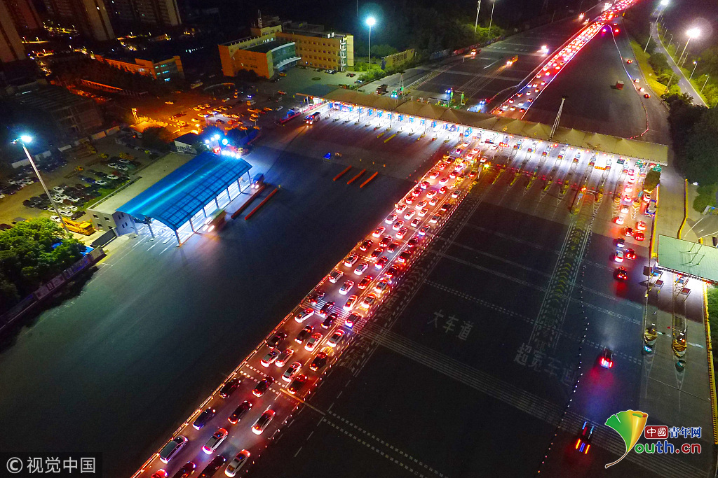 2018年10月1日,國慶假期首日凌晨1點左右,南京迎來出行高峰,所有高速公路出城方向迎來大批車輛,航拍南京長江二橋收費站,大量車輛排起長龍,場面尤為壯觀。圖片作者:方東旭
