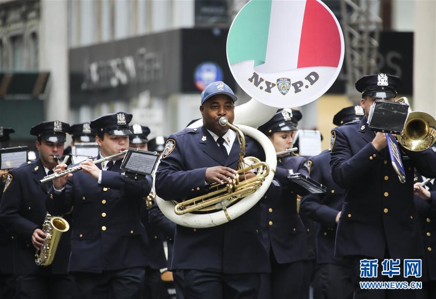 10月8日,在美國(guó)紐約曼哈頓第五大道,紐約警察樂(lè)隊(duì)參加哥倫布日游行。 新華社記者王迎攝