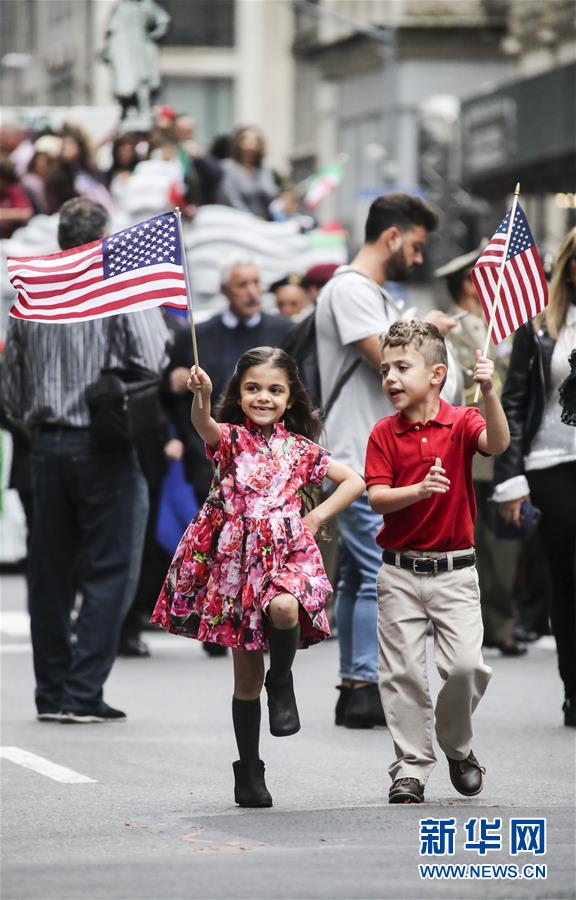 10月8日,在美國(guó)紐約曼哈頓第五大道,兩名兒童參加哥倫布日游行。 新華社記者王迎攝
