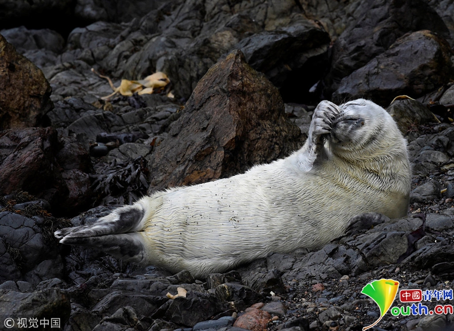 中國青年網(wǎng)北京10月9日電 當?shù)貢r間2018年10月8日,英國彭布羅克郡,一只大西洋海豹幼崽躺在海邊礁石上。海豹幼崽出生時都有毛茸茸的白色非防水皮毛,它們會在第四周蛻皮。