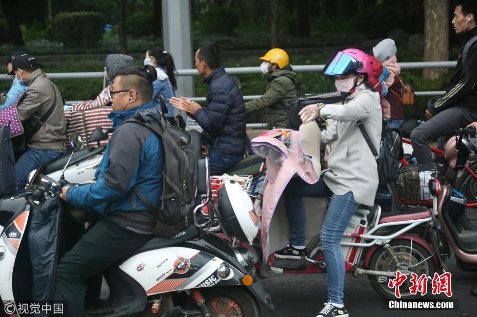 2018年10月9日,山東濟(jì)南,昨日一場(chǎng)秋雨過后開始降溫,今天清晨最低氣溫只有6度,馬路上不少上班族穿上羽絨服騎車趕上班路。 圖片來源:視覺中國