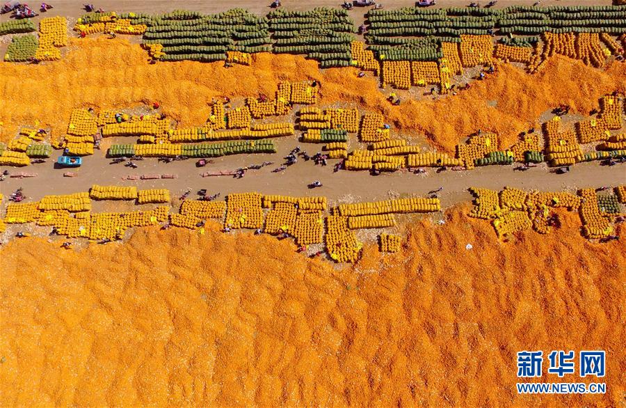 10月14日,河北省南和縣閆里鄉(xiāng)閆里村農(nóng)民在晾曬收獲的玉米(無(wú)人機(jī)拍攝)。