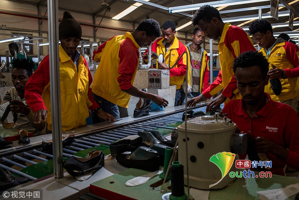 華堅(jiān)鞋廠的制鞋流水線。據(jù)華堅(jiān)集團(tuán)官網(wǎng)介紹,每年約240萬(wàn)雙包括NineWest、GUESS 在內(nèi)的品牌女鞋帶著“Made In Ethiopia”(埃塞俄比亞制造)的標(biāo)簽,從這里流向美國(guó)市場(chǎng)。