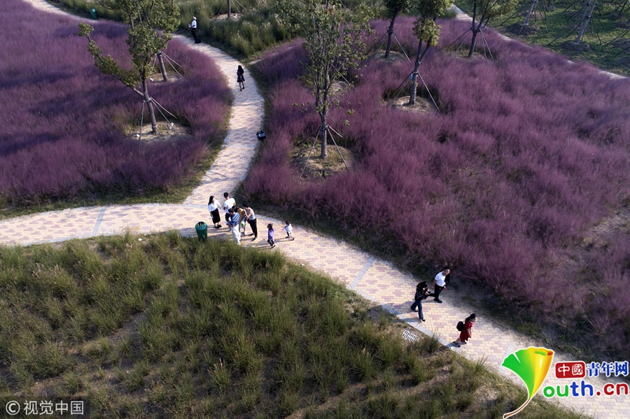 游客在生態(tài)樂園粉黛亂子草和風(fēng)車前留影。