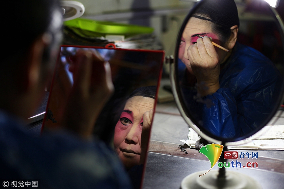 2016年3月10日,陜西安康,今年70歲的劉鳳鳴10歲時(shí)開始學(xué)漢調(diào)二黃,40歲時(shí)從廁所抱回智殘?bào)w殘棄嬰,因?yàn)閷?duì)藝術(shù)的熱愛(ài)、對(duì)生命的敬畏她選擇了不離不棄。人生如戲,戲如人生。劉鳳鳴說(shuō),像她們這樣的業(yè)余劇團(tuán),沒(méi)有專門的化妝師,她要求每個(gè)演員必須學(xué)會(huì)化妝。圖片作者:魏永賢/視覺(jué)中國(guó)