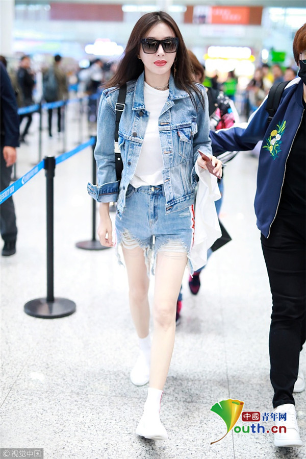 2018年10月17日,上海,秦嵐現身機場。她一身牛仔LOOK露出白皙長腿,雪膚紅唇美得不可方物,長發(fā)飄飄玉手撩發(fā)女神范十足。