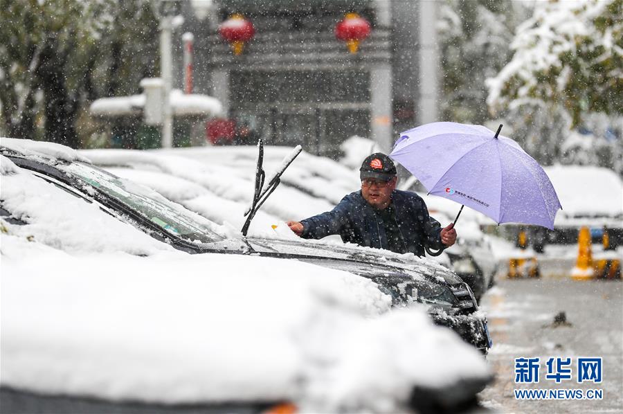 10月18日,烏魯木齊市民在清理車上的積雪。當(dāng)日,新疆烏魯木齊迎來一場(chǎng)降雪。 新華社記者 江文耀 攝