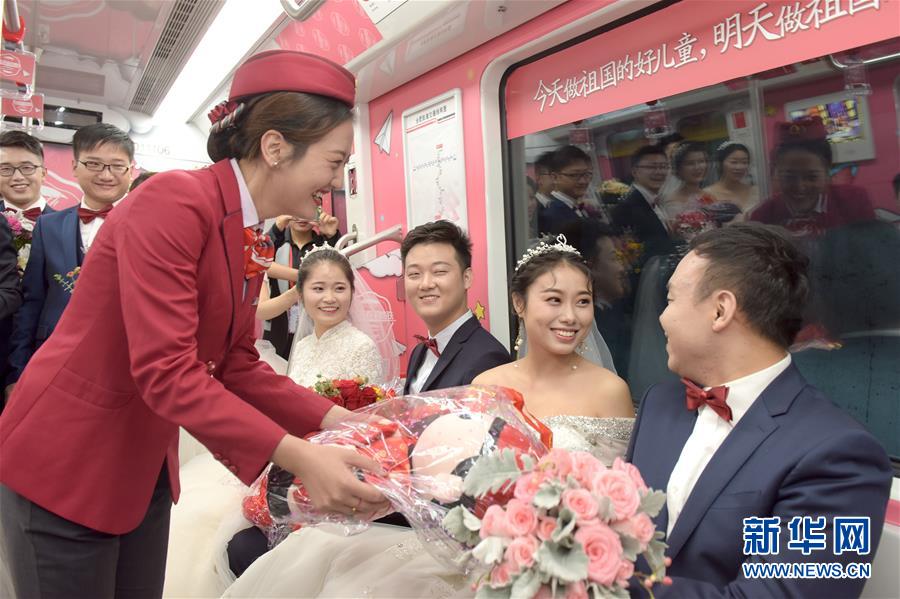 10月18日,在合肥市地鐵一號線車廂內(nèi),地鐵工作人員向新人們送禮物。當(dāng)日,中鐵四局集團城市軌道交通工程分公司的18對新人在安徽合肥地鐵一號線的車廂里舉行了一場集體婚禮儀式。 新華社記者 郭晨 攝