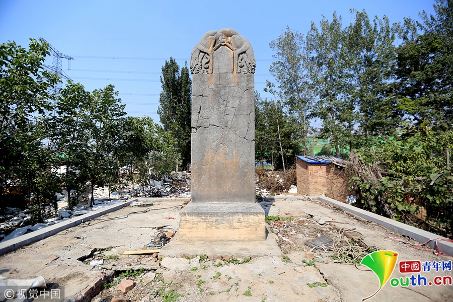 中國青年網(wǎng)北京10月21日電 近日,鄭州市惠濟(jì)區(qū)古滎鎮(zhèn)嶺軍峪村已經(jīng)因?yàn)槌鞘械陌l(fā)展被拆遷了,村民們住在安置房里等待著新房的建成,而在嶺軍峪村南約150米的田地里,有一塊在2009年文物普查時(shí)被發(fā)現(xiàn)的唐代石碑,在鄭州市發(fā)現(xiàn)唐代的碑刻是比較罕見的。 圖片來源:視覺中國