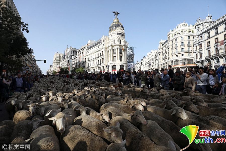 當(dāng)?shù)貢r(shí)間2018年10月21日,西班牙馬德里,西班牙牧羊人驅(qū)趕成百上千只綿羊穿越馬德里市街,展示古老的游牧習(xí)俗。這項(xiàng)活動(dòng)是為了捍衛(wèi)承襲自古代的“牧羊權(quán)”,并且抗議現(xiàn)代生活方式以及都市化,侵害牧民的權(quán)益。