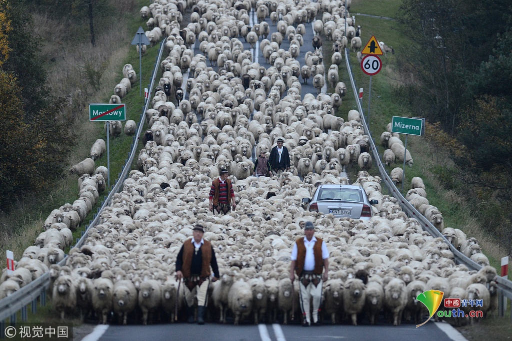 2018年9月27日訊(具體拍攝時(shí)間不詳),波蘭,浩浩蕩蕩的綿羊大軍為了趕在冬天之前回到農(nóng)場過冬,阻斷了鄉(xiāng)村的主車道。