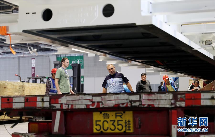 10月22日,德國(guó)工程師馬丁·霍爾茨海德(中)在吊裝過程中查看“金牛座”龍門銑床床身位置。 當(dāng)日,來自德國(guó)的首屆進(jìn)口博覽會(huì)最大展品——“金牛座”龍門銑床完成初步組裝,將運(yùn)往國(guó)家會(huì)展中心(上海)3號(hào)館進(jìn)行最后的安裝施工。這是德國(guó)瓦德里??票す狙邪l(fā)的機(jī)床設(shè)備,高約8米,占地面積約200平方米,將在智能及高端裝備區(qū)進(jìn)行展出。 新華社記者方喆攝